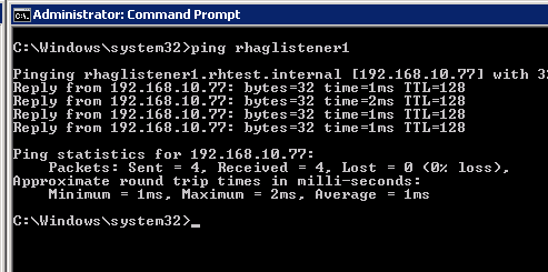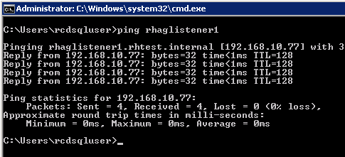 Pinging the listener from RHDB1 works just fine. The UDL connection also works fine. Ping from the DNS server, not immediately, but it seemed to resolve after about a minute.