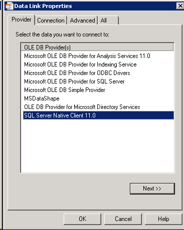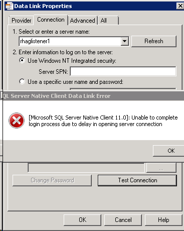Click on the Provider tab, and change the provider to SQL Server Native Client 11.0, click Next and fill out the connection information, entering in your listener name in the “Select or enter a server name” drop-down. Next, select or type in a database name and click Test Connection.