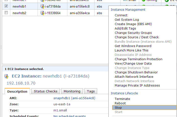 Let’s try one more thing. Let’s cause an automatic failover. Let’s go into the AWS console and stop the instance that the current primary is running on. In my case, the Primary is running on RHDB1.